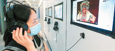 安徽徽州历史博物馆通过系列展陈、VR、多媒体投影等技术,为公众提供沉浸式体验。图为市民在该馆聆听徽州戏曲。施亚磊摄(人民图片)