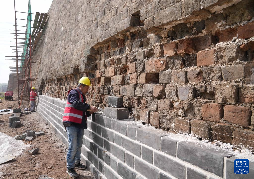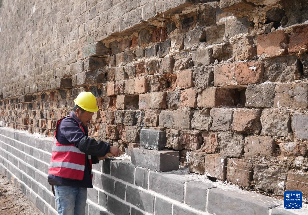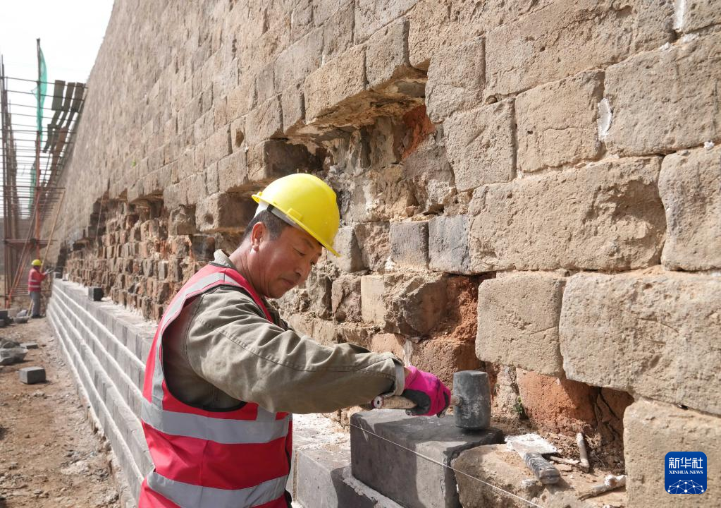 4月26日,工人在山海关长城北翼城修缮工程工地施工。