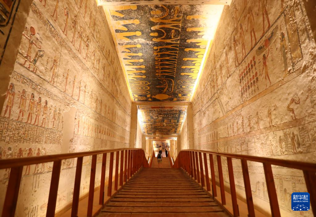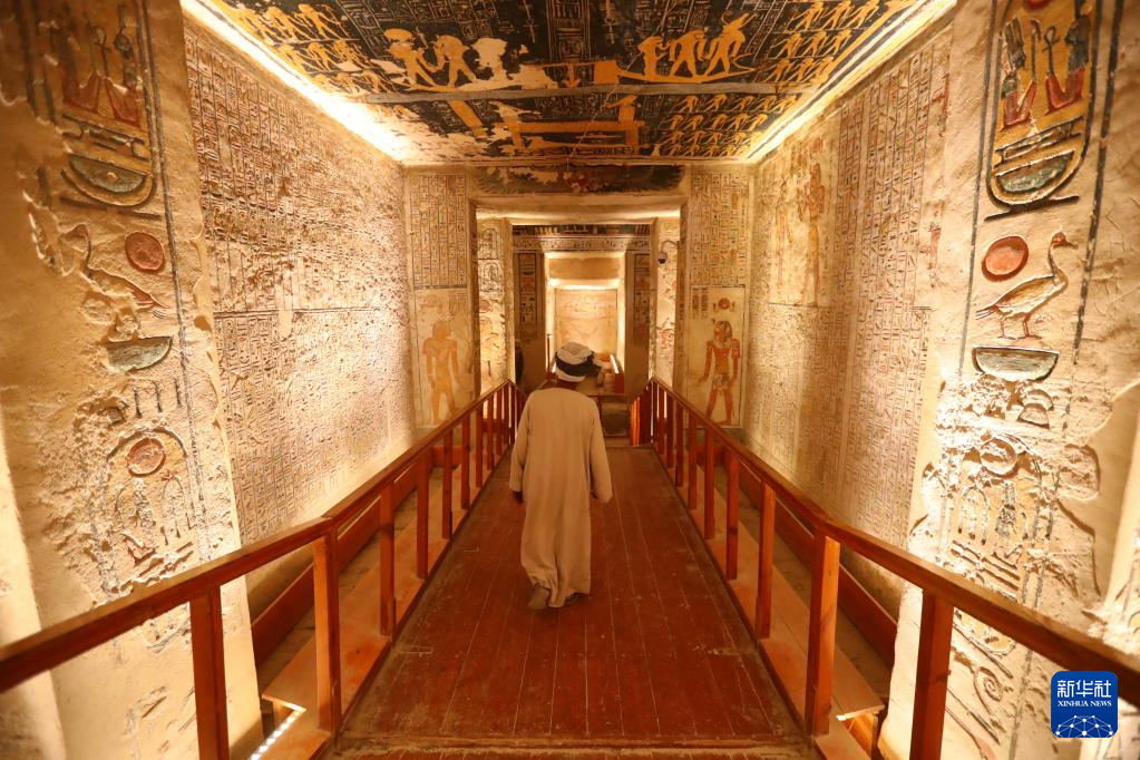 4月26日,在埃及卢克索帝王谷,工作人员在法老拉美西斯六世陵墓内巡视。