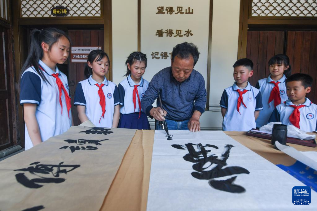 5月6日,在河桥镇文化礼堂内,当地“清廉文艺宣传队”队员带领河桥镇小学学生书写清廉家风书法作品。