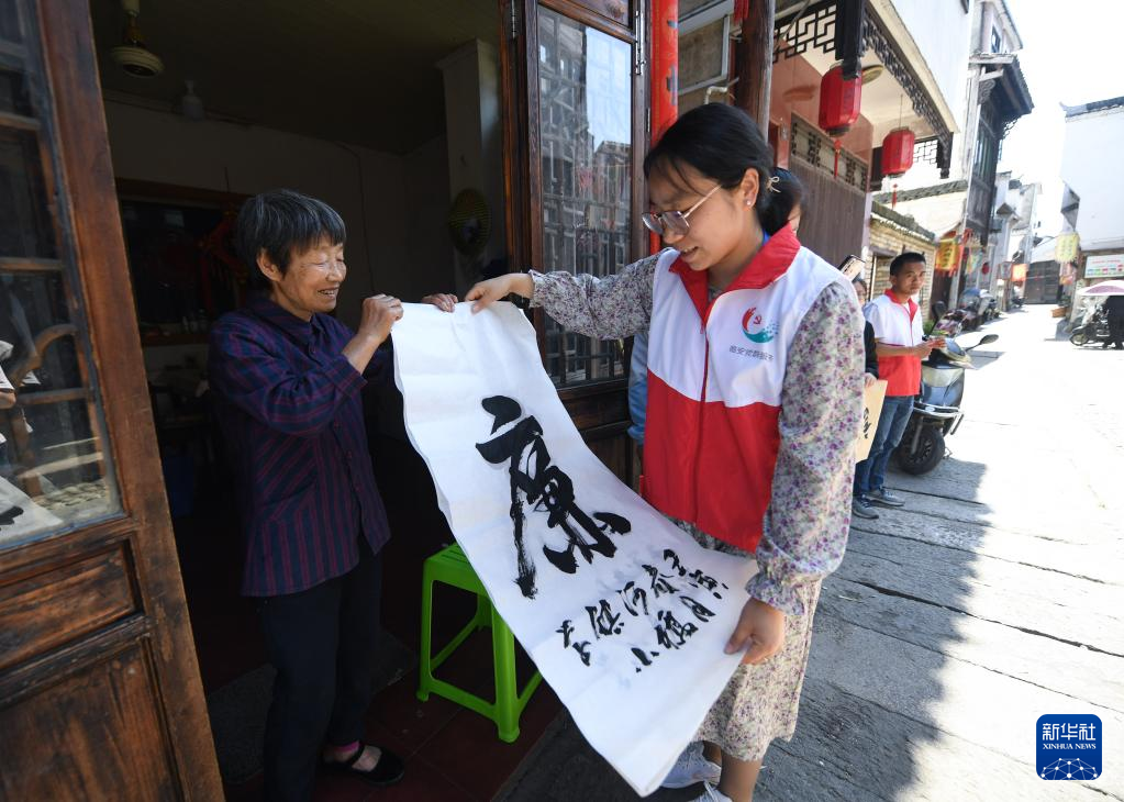 5月6日,河桥镇的纪检干部(右)将清廉家风书法作品赠送给河桥古镇老街上的居民。