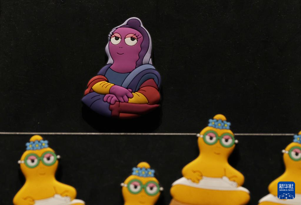 这是5月11日在法国巴黎卢浮宫官方纪念品店拍摄的蒙娜丽莎造型的法国著名动画片《巴巴爸爸》中人物巴巴贝尔的冰箱贴。