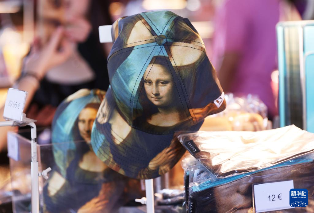 这是5月11日在法国巴黎卢浮宫官方纪念品店拍摄的印有蒙娜丽莎形象的帽子。