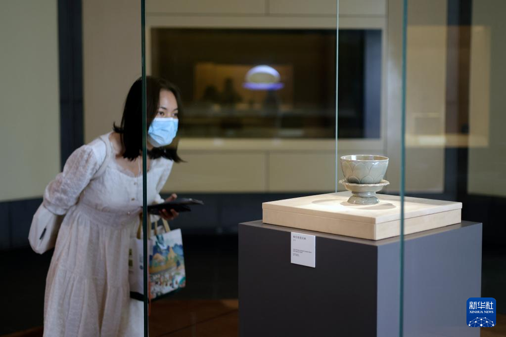 5月15日,游客在苏州博物馆观看秘色瓷莲花碗。
