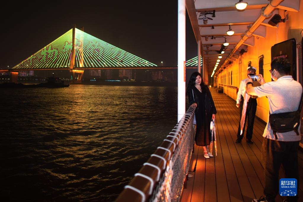 5月18日,游客在船上拍摄长江边的灯光秀。