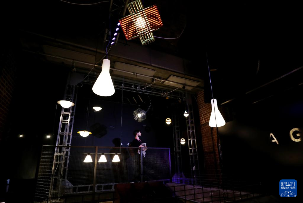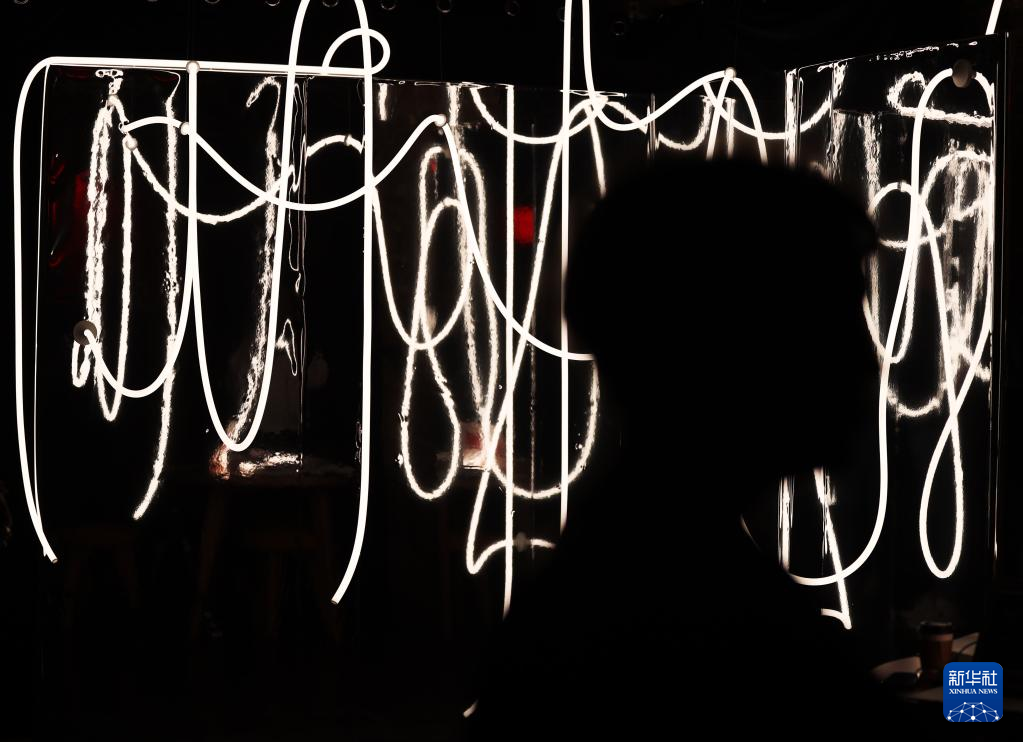 5月24日,一名男子在英国伦敦举行的克拉肯韦尔设计周上参观灯光装置作品。