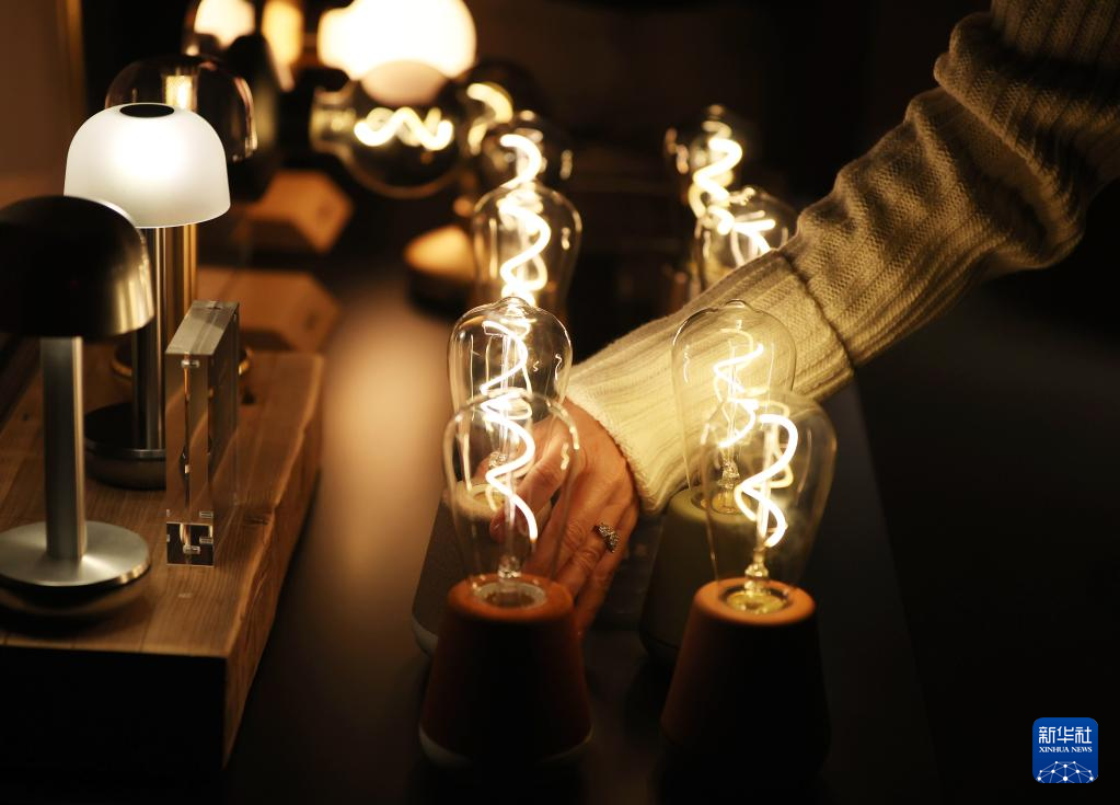 5月24日,一名女子在英国伦敦举行的克拉肯韦尔设计周上参观照明装置。