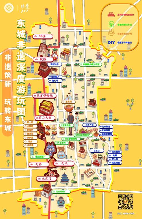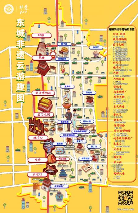 荟集东城非遗资源内容、趣游线路、打卡点位的《东城非遗云游趣图》通过手绘地图的形式,精选东城区地标建筑、街区及与之相关的非遗代表性项目,重点展示故宫、天坛、智化寺等二十余个非遗点位以及景泰蓝制作技艺、都一处烧麦制作技艺、北京泥人张等四十多个非遗项目。以此为基础我们还为您提炼出了“养生在东城——吃点讲究的!”“会玩在东城——玩儿点有趣的!”“匠心在东城——看遍极致的!”“聆听在东城——听点地道的!”等非遗游览线路。