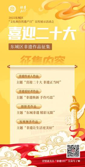 “非遗正当时 青春风华茂”——2022年东城区“文化和自然遗产日”主题宣传活动将从6月9日起持续更新,内容包括《东城非遗云游趣图》上线、东城非遗青年说、献礼二十大非遗作品云上征集令等主题板块。
