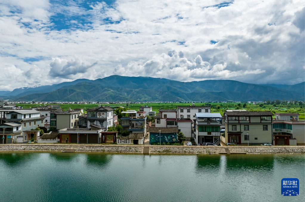 刘志诚在永胜县三川镇进行墙绘创作(无人机照片,6月24日摄)。