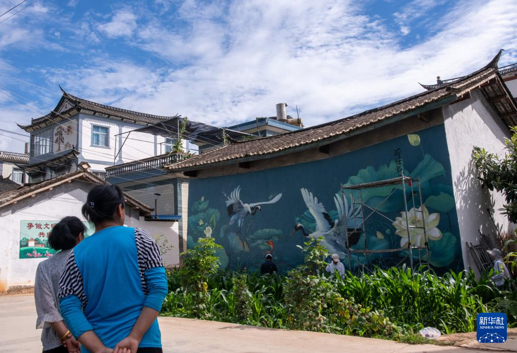 永胜县三川镇翠湖村村民观看刘志诚的墙绘作品(6月24日摄)。