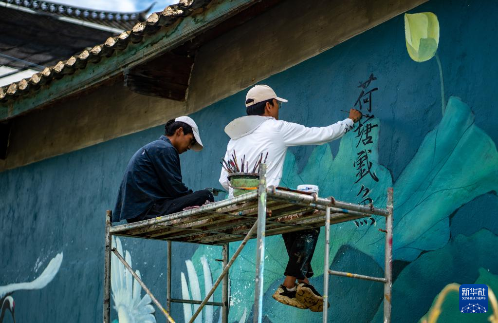 刘志诚(右)在永胜县三川镇进行墙绘创作(6月24日摄)。