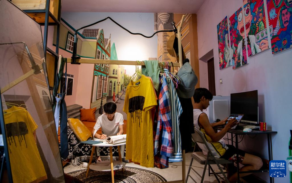 刘志诚(左)与小伙伴一起在家中构思墙绘草稿(6月25日摄)。