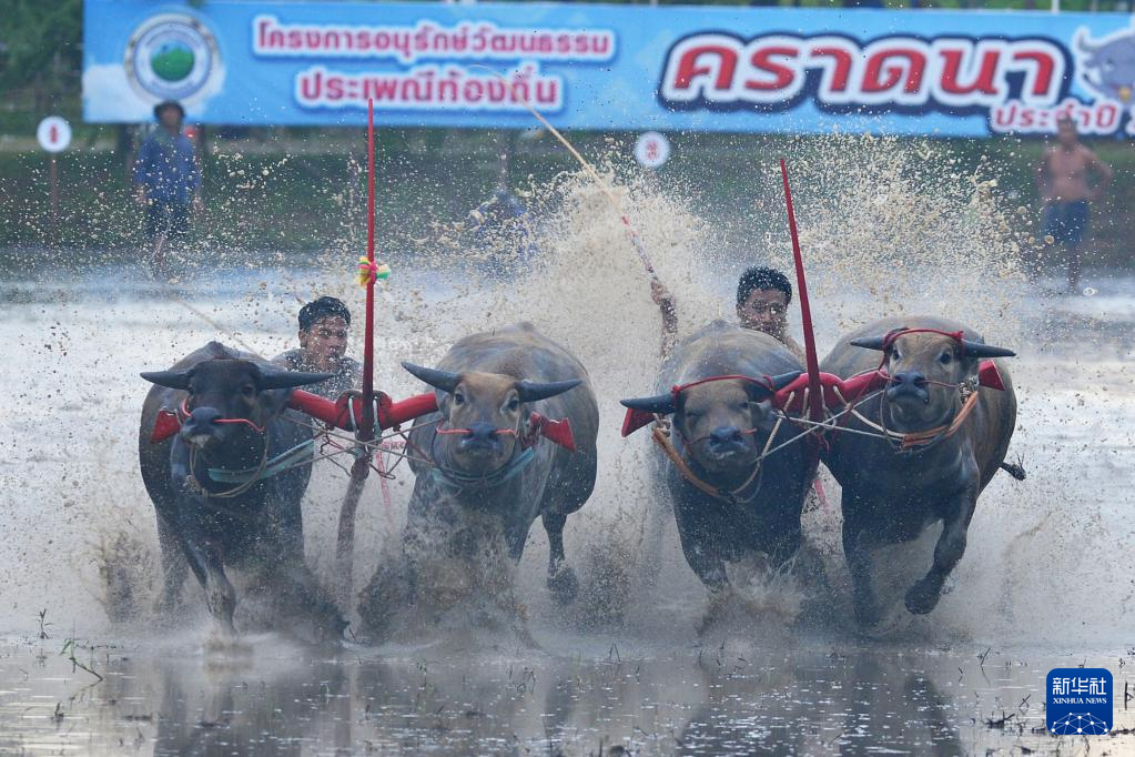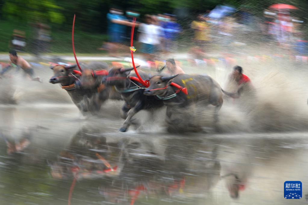 6月26日,参赛者在泰国春武里府驾驭水牛参加比赛。