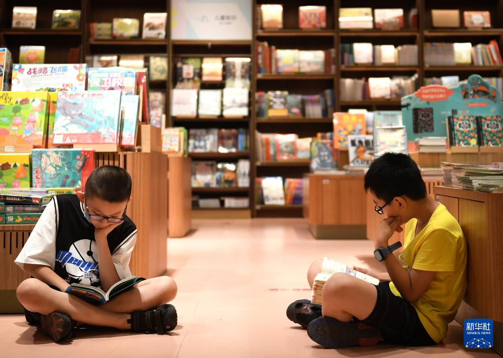 7月12日,在西安市莲湖区一书店内,两名小朋友在阅读。