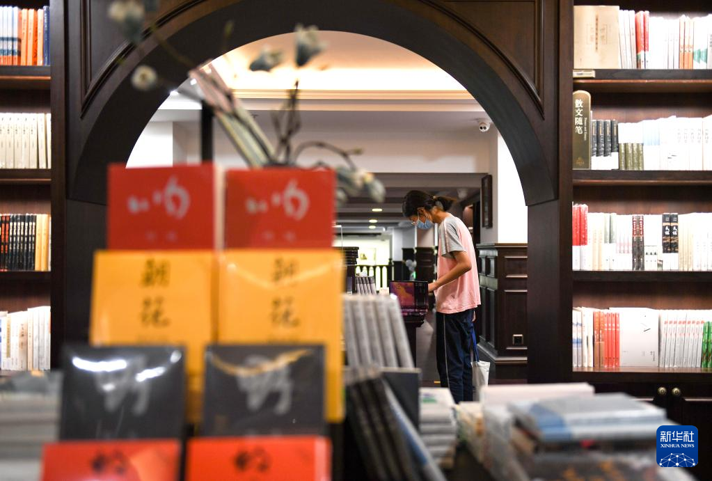 7月12日,西安市钟楼附近一书店内,一名女孩在文学区书架前浏览。