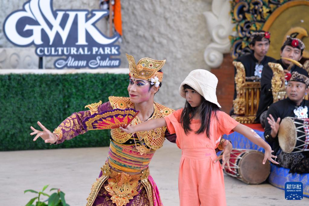 7月10日,在印度尼西亚巴厘岛一处文化公园,舞者与小观众互动。
