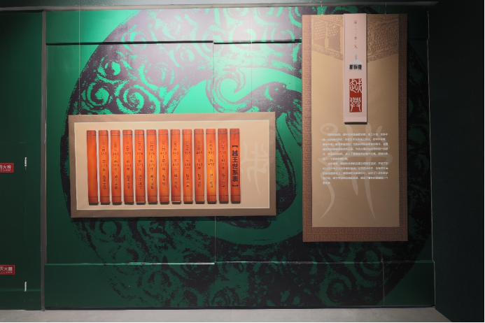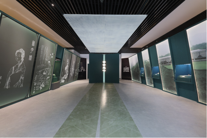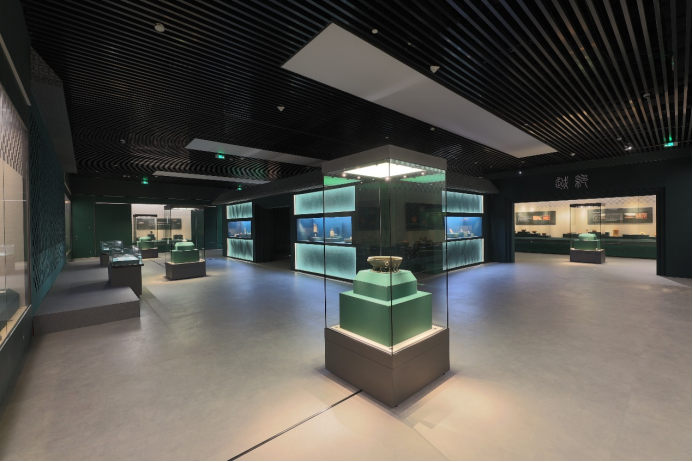 展览根据主题及展品,选用了“青铜绿”为主色调,同时展厅充分利用紧凑的空间,布设历史场景,营造起承转合的场景氛围,同时以动态及静态的文物、文字与场景,交错呈现那一段充满波折又影响深远的百越翘楚时代。
