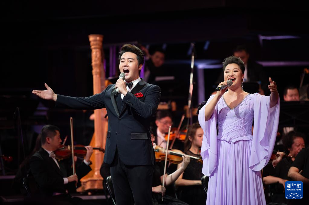 7月25日,歌唱演员王丽达(右)、张英席在2022北京西山永定河文化节开幕式上演唱。