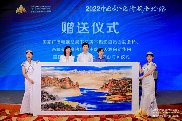 8月3日,在江西井冈山举办的2022中国文化经济发展论坛上,国家广播电视总局书法美术摄影委员会副会长、西藏美术家协会副主席唐天源向新华网赠送画作《蓝天净土大美山河》原作和数字版权。唐天源希望借由此画,表达对新华网举办文化论坛、推动文化产业发展的支持。新华网股份有限公司副总裁杨庆兵代表新华网上台接受赠送。