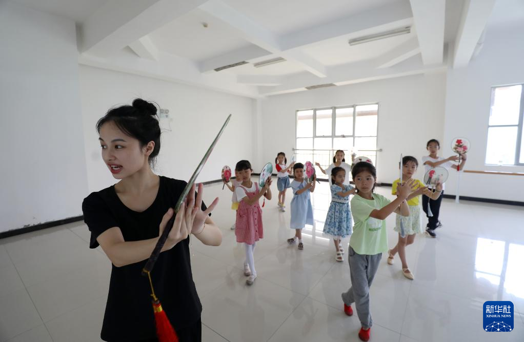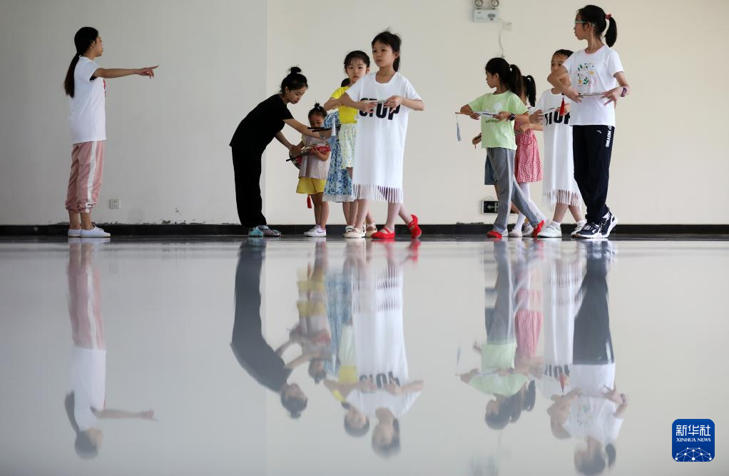 7月31日,在湖南省昆剧团教室,演员带领孩子们练习昆曲动作。新华社发(李科摄)