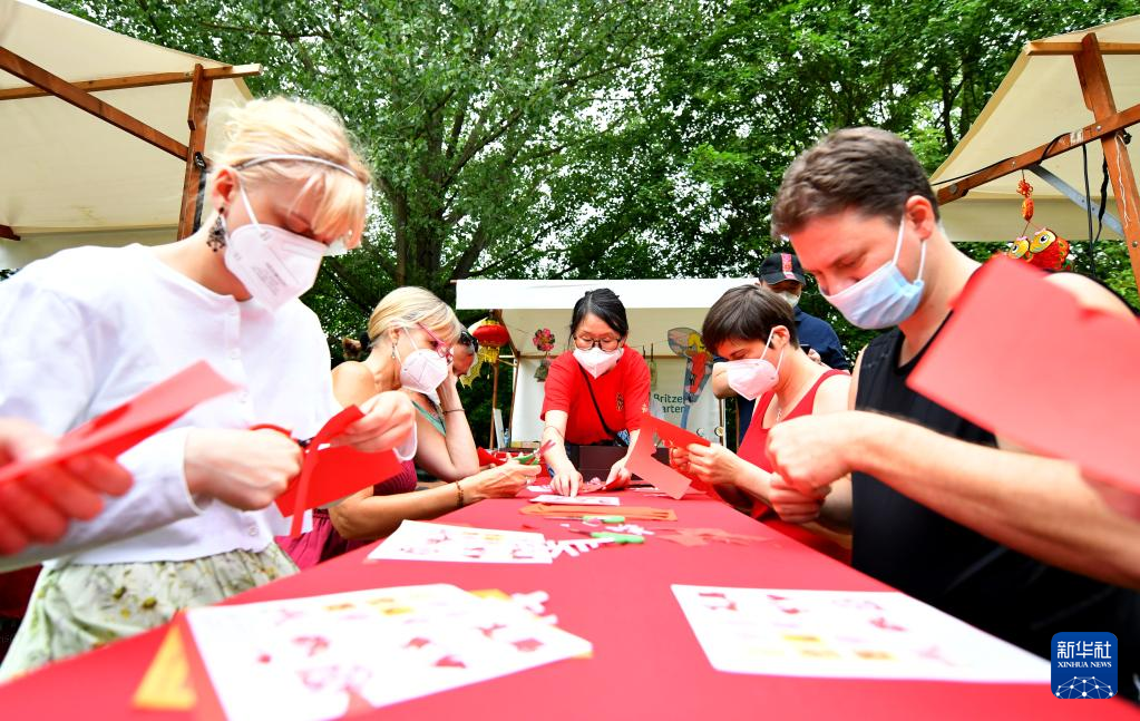 8月13日,在德国柏林世界公园,人们在中国展区学习剪纸。
