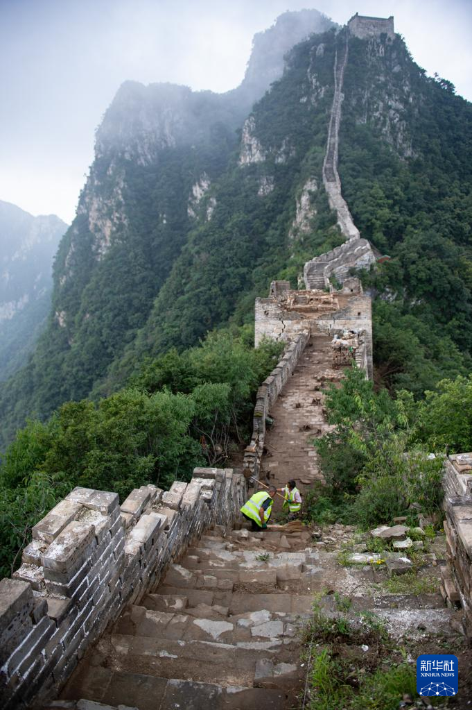 时值末伏,北京市北郊山脊上,箭扣长城的两个修缮段施工正酣。位于箭扣长城西面的“西大墙”是箭扣长城第四期修缮工程所在地,长达1678米的墙体上坐落着8个敌台。按计划第四期修缮工程将于10月底完工,目前工程已完成约70%。