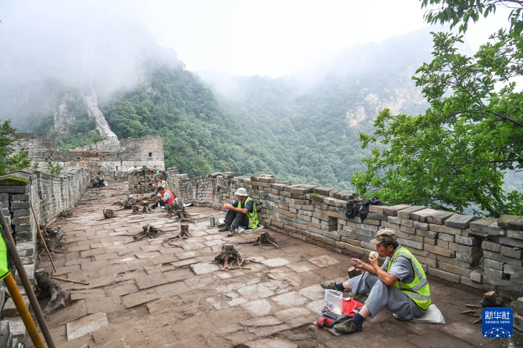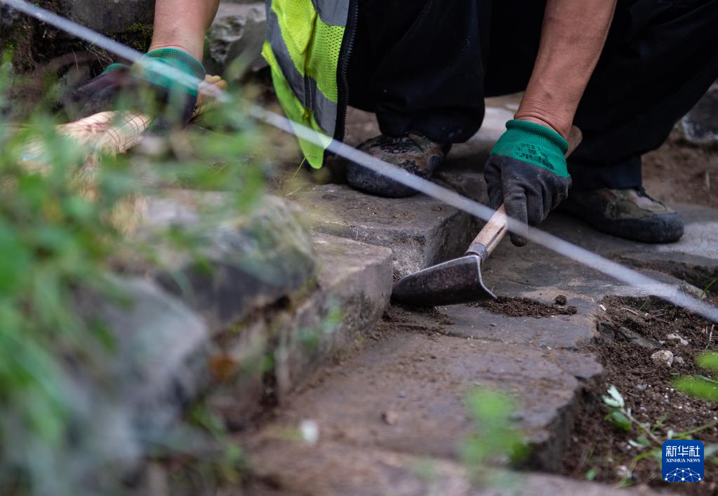 工人在“西大墙”段南端的“北京结”敌台下铺砌台阶(8月16日摄)。