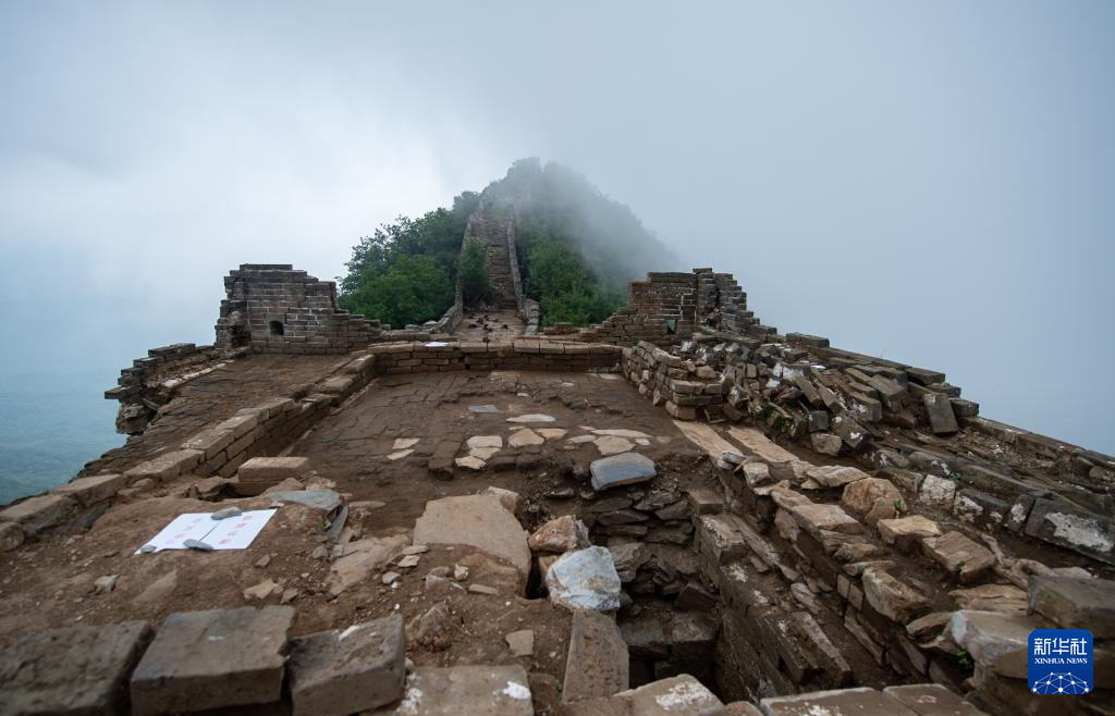 研究性修缮段145号敌台二层,地面右上方一处倒塌的边墙反映了墙体坍塌的时序,后续将对其进行研究性展示(8月17日摄)。