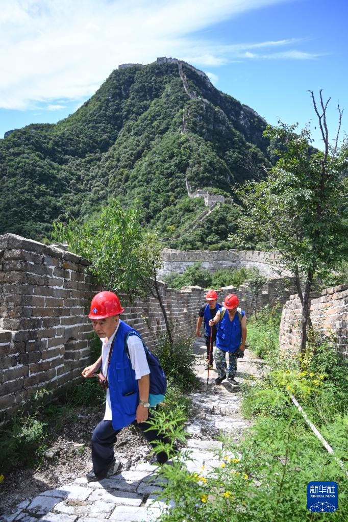 66岁的工程师程永茂(前)和工友在“西大墙”段向修缮工地行进(8月16日摄)。