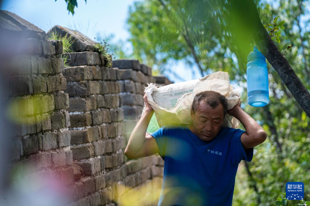 工人在“西大墙”段向修缮中的敌台运送施工材料(8月16日摄)。