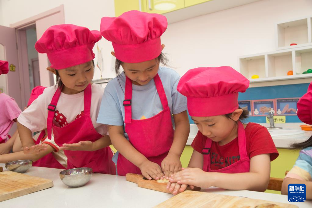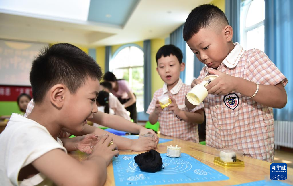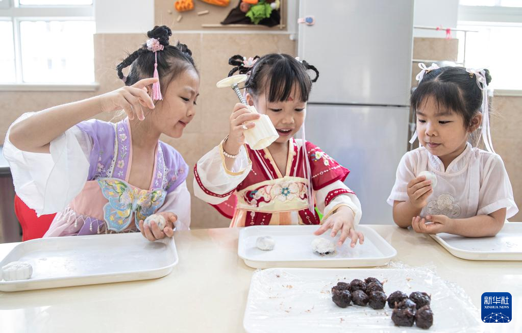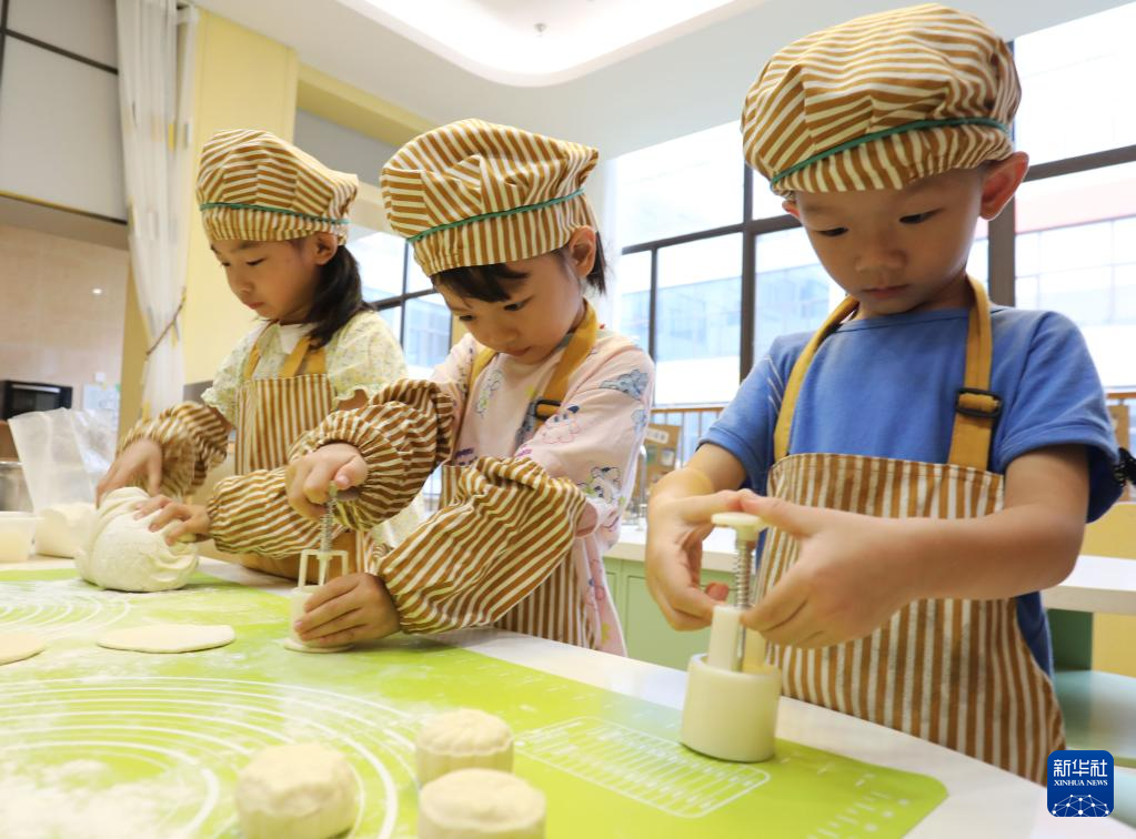 9月8日,河南省洛阳市河柴幼儿园的小朋友在体验制作手工月饼。新华社发(黄政伟摄)