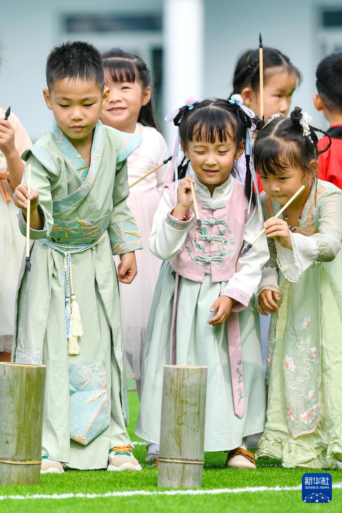 9月8日,浙江省湖州市长兴县煤山镇中心幼儿园的小朋友在体验投壶游戏。新华社发(谭云俸摄)