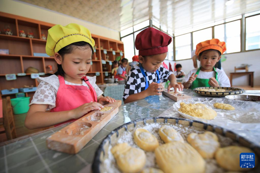 9月8日,北京门头沟妙峰山民族学校附属幼儿园的孩子们在制作月饼。新华社发(侯继庆摄)