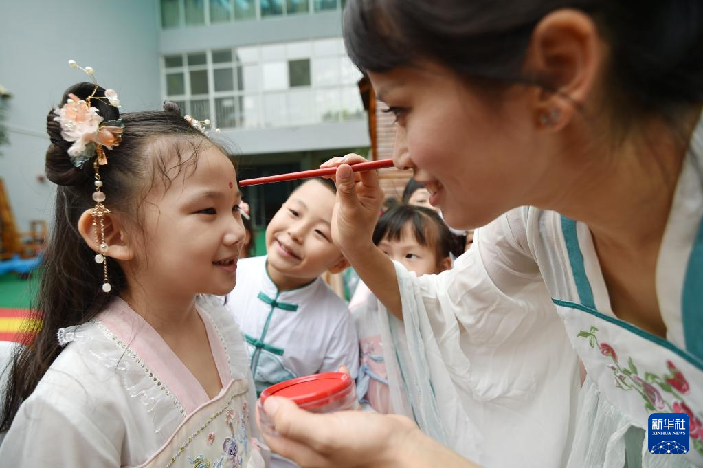 9月8日,江苏省南京市建邺区金地名京幼儿园的老师为小朋友点朱砂。新华社发(方东旭摄)