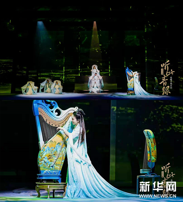 箜篌作为丝绸之路上中西方文化交融的经典乐器之一,音域宽广、音色柔美清澈,表现力强,是宝贵的非物质文化遗产。据悉,作为河南省非遗研究基地的“久鼎箜篌”,为本音乐会特别打造了一古一今两台“千里江山-青绿箜篌”,其琴身上描绘出青山绿水的壮丽秀美,见器如见景,以便更好的呈现独步千载,追怀古乐,凤翔经野的意境。同时,另有一台箜篌由青年箜篌演奏员郝晨阳演奏,并充分参与到整场音乐会多首曲目之中。三台箜篌的运用,在为音乐会增色添彩的的同时,也体现了该乐器自失传中涅槃,在新时代拥抱复兴的发展形势。