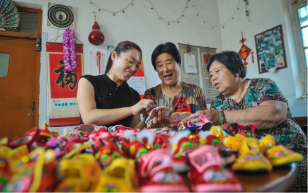 传统的虎头鞋多为敞口鞋,用以配搭孩子的裹脚棉裤,随着生活习俗的改变,张晓芸也不断丰富着虎头鞋的式样。“老手艺要有新发展,我和团队定下目标,每月至少推出5款新品。颜色上仍以红、黄两种颜色为主色,但加入不同颜色的配色;款式上,面向不同年龄阶段的儿童有针对性地进行设计。”张晓芸说,目前,其手工艺坊开发的虎头鞋新款达百余种。此外,她还制作开发了很多和虎有关的产品,如香包、虎头枕、虎头帽等,其中香包和虎头枕用艾叶和夏津的古桑树桑叶做填充原料,不仅寓意美好还有保健的功效,深受欢迎。