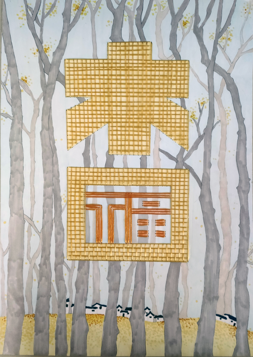 《杏福》以金澄澄的蚕丝编织成“杏福”二字,背景为铺满漫山的银杏,几幢万市山房错落有致地藏匿于银杏树中,与金色的村落融为一体,秋日风情扑面而来。