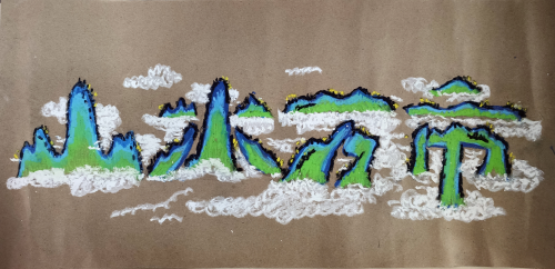 《山水万市》这幅作品用油画棒复刻古画韵味,“山”“水”“万”“市”四个大字以青山绿水画中的山川形象逐一呈现,蓝色、青色、黑色交替叠加,在蓝天白云之下,流水潺潺之间,整幅画作弥漫着只此青绿的江南韵味。