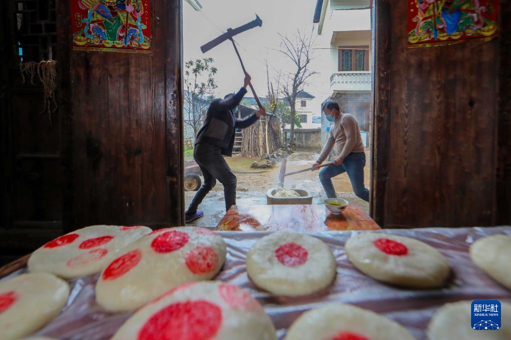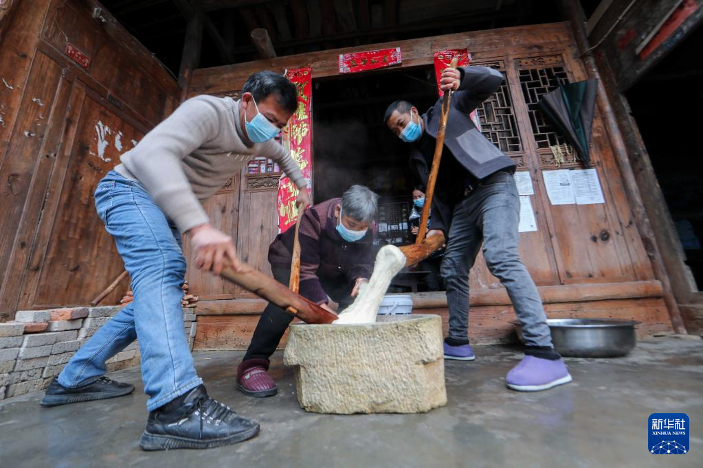 12月27日,岑巩县水尾镇马家寨村村民在打糍粑。