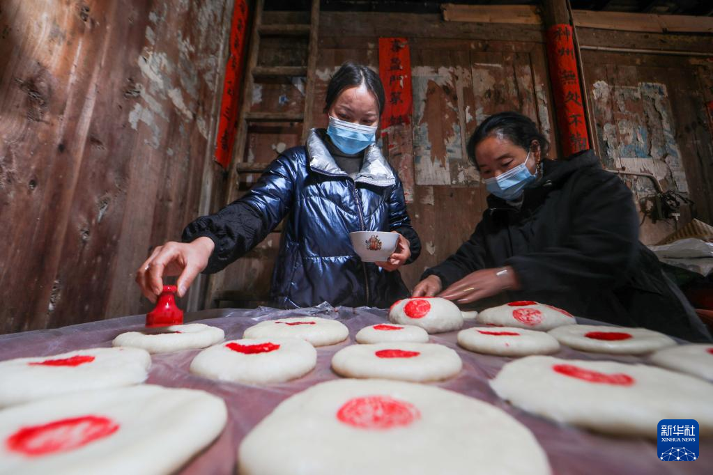 12月27日,岑巩县水尾镇马家寨村村民给糯米糍粑印花。