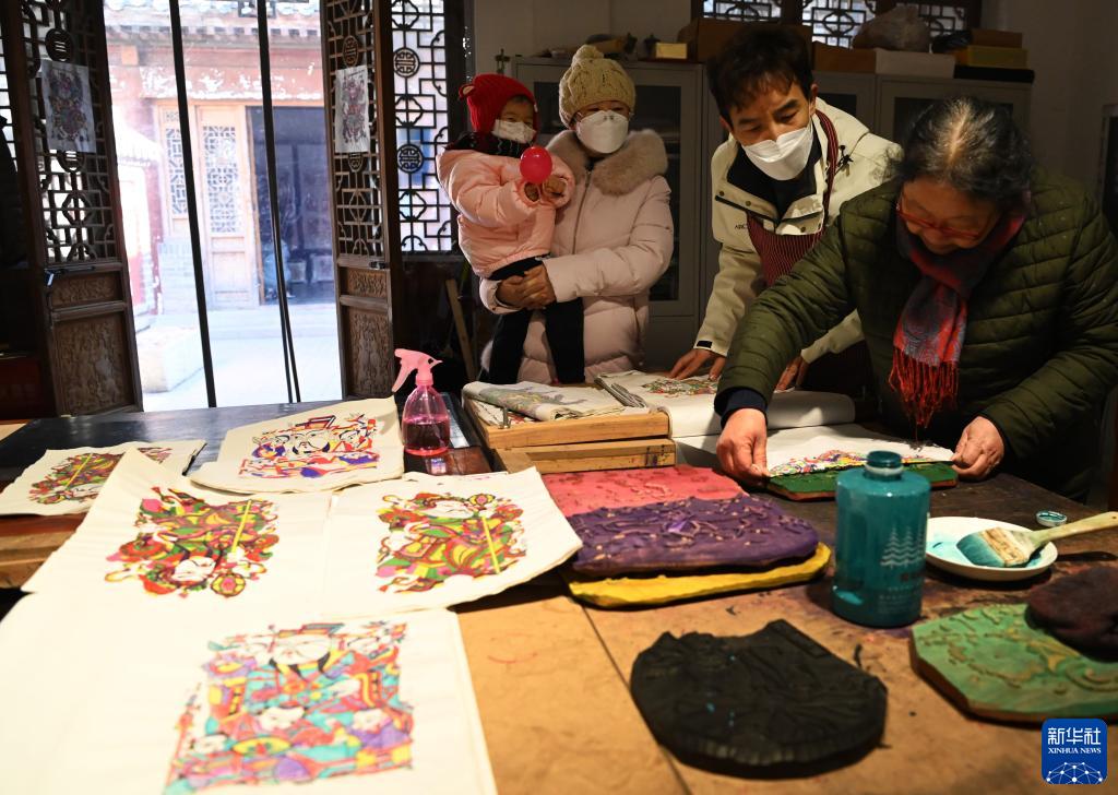 游客在山东省聊城市东昌府木版年画博物馆学习印制东昌府木版年画(1月27日摄)。新华社发(张振祥 摄)