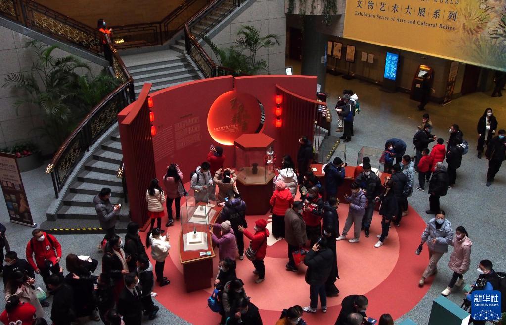参观者在上海博物馆大堂里观看兔年迎春展(1月22日摄)。新华社记者 任珑 摄
