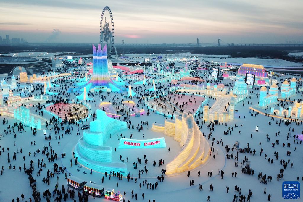 游客在哈尔滨冰雪大世界园区内游玩(1月25日摄,无人机照片)。新华社记者 王建威 摄