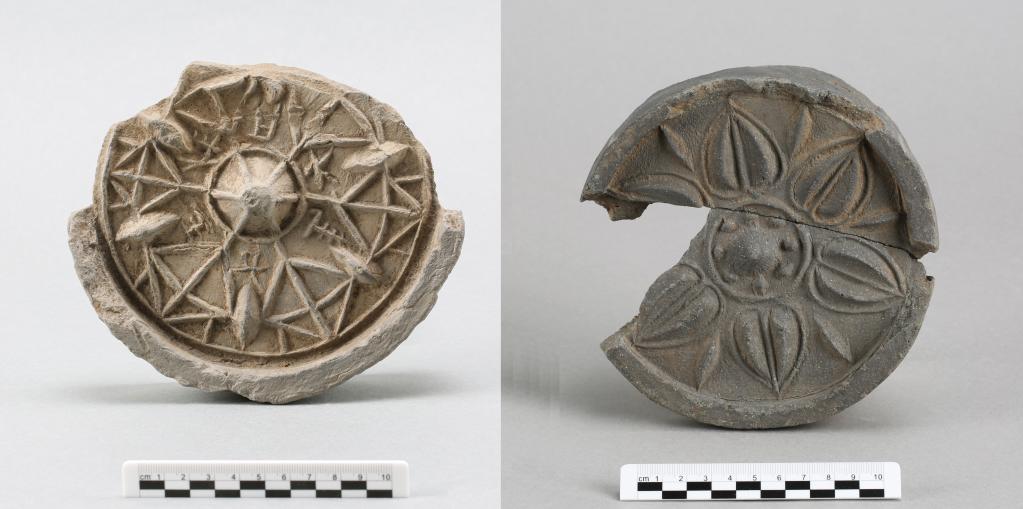 古城村1号寺庙址出土的“壬子年六月作”铭瓦当、倒心形莲纹瓦当。吉林省文物考古研究所供图