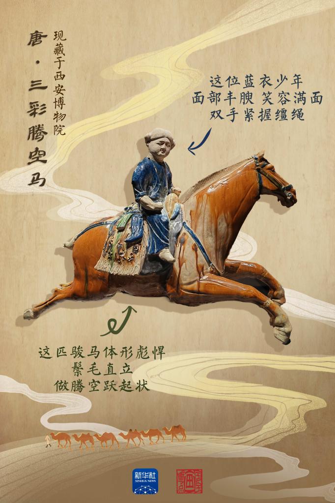1000多年前,一位来自西域的“蓝衣少年”,穿过茫茫戈壁、广袤沙漠,抵达长安。这位“蓝衣少年”,是西安博物院“明星”藏品——唐代三彩腾空马之上的骑手。“他”,也见证了这场跨越千年的文明交融。
