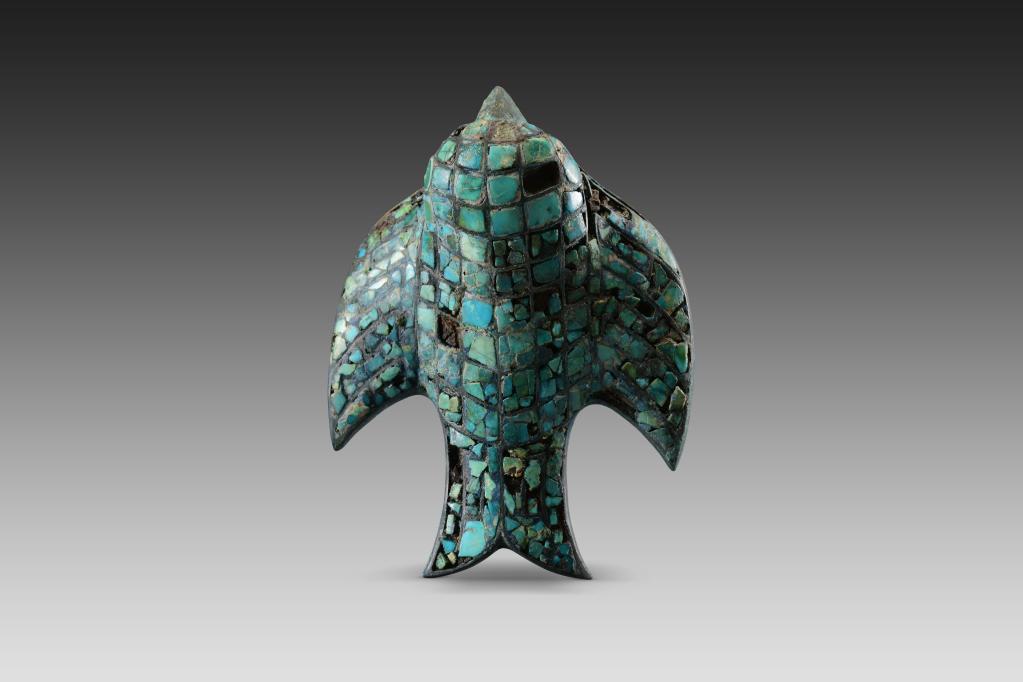这是在寨沟遗址发现的绿松石铜鸟饰。陕西省考古研究院供图