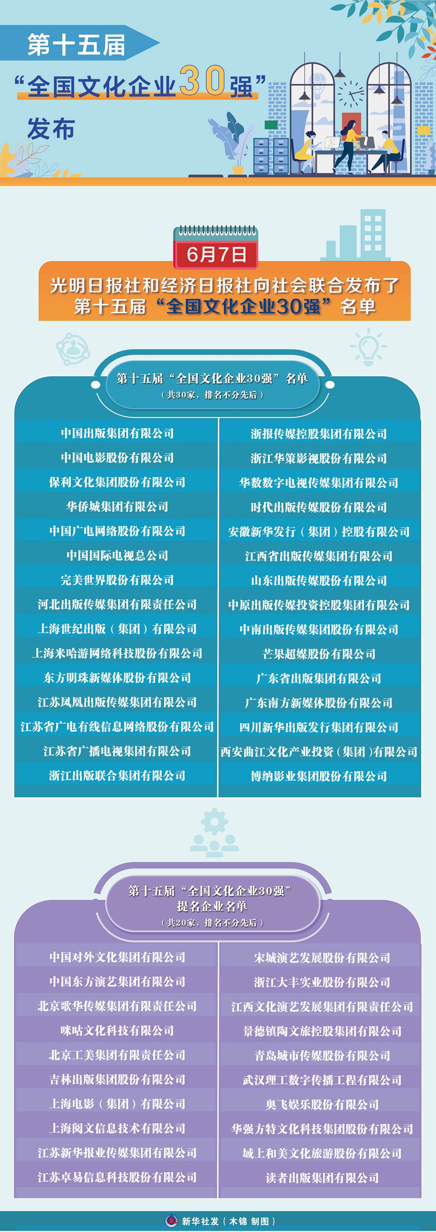 新华社深圳6月7日电 6月7日,光明日报社和经济日报社向社会联合发布了第十五届“全国文化企业30强”名单。中国出版集团有限公司、中国电影股份有限公司等30家企业进入行列。