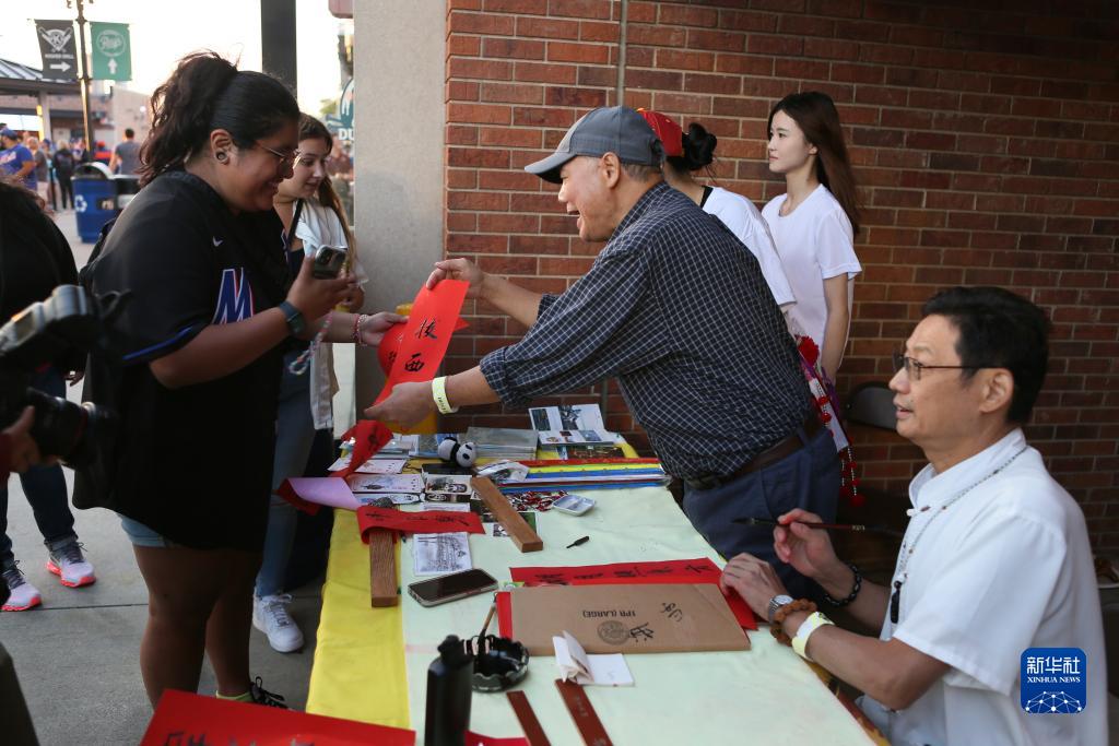 9月1日,在美国纽约大都会棒球队主场花旗球场举行的“中华之夜”暨“你好!中国”旅游推广品牌发布活动上,工作人员向观众赠送“墨宝”。新华社记者 张凤国 摄