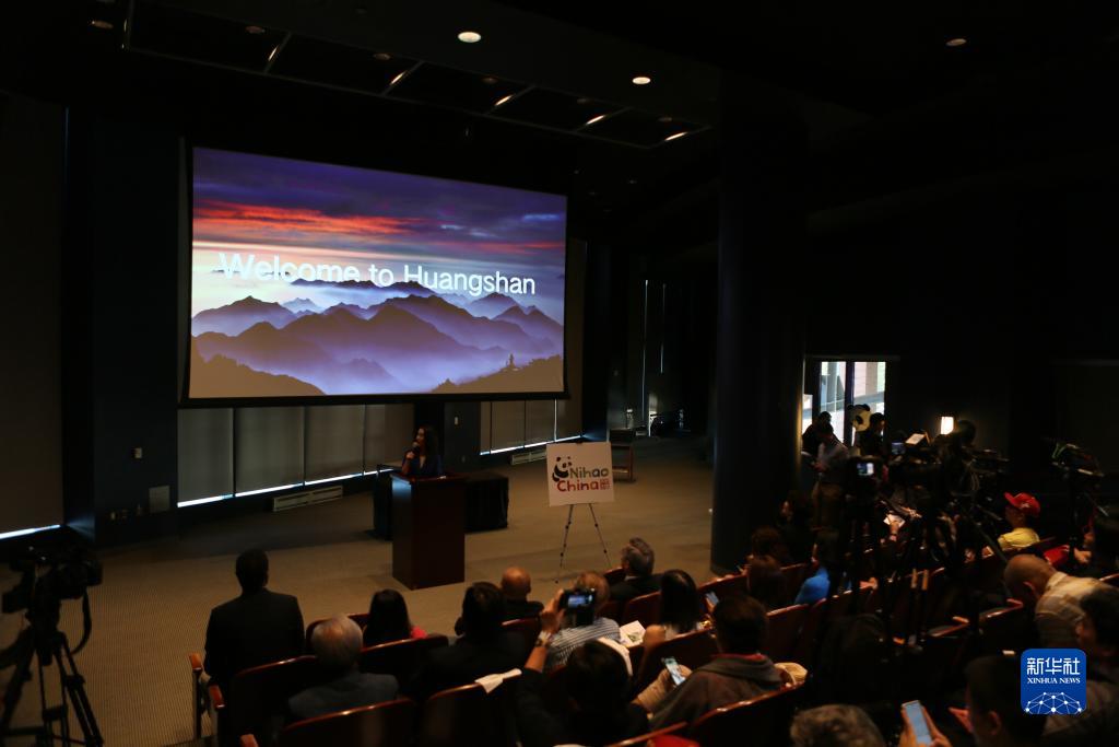 9月1日,人们在美国纽约大都会棒球队主场花旗球场举行的“中华之夜”暨“你好!中国”旅游推广品牌发布活动上观看黄山风光短片。新华社记者 张凤国 摄
